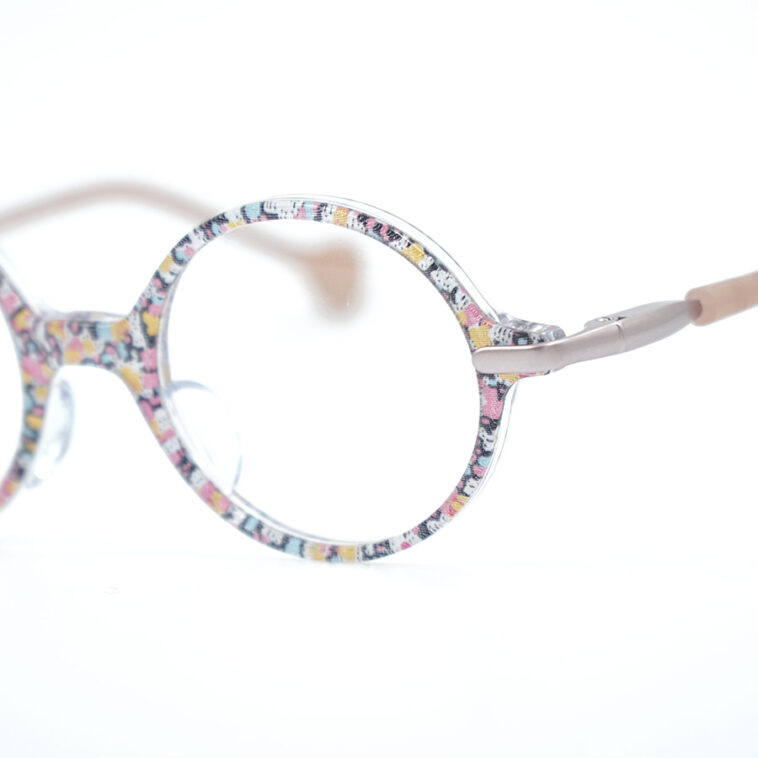 フレームは、丸みのあるラウンドタイプでやさしく可愛らしい印象。透明感のあるクリアフレームの中に、色とりどりの小花のような柄が散りばめられており、表情が楽しいデザインです。華やかさがありながらも上品で、コーディネートに自然と馴染みます。