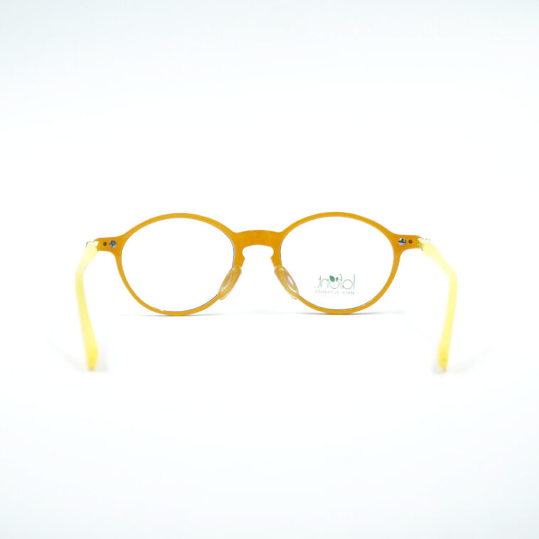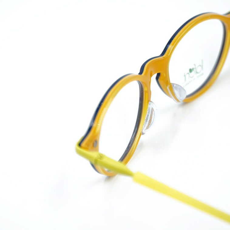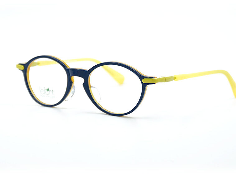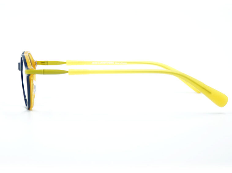落ち着いた知的なネイビーのフロントデザインに、裏側には、まぶしいほどの鮮やかなイエローがプラス。瞬きや横を向いた瞬間にチラリとのぞくバイカラーは、日本の眼鏡にはないフランス流の「粋」な遊び心を感じさせます。